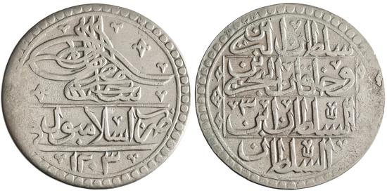 | Ottoman: Selim III (1789-1807), silver yuzluk / 100 para (31.59g), Islambul (Istanbul) mint, AH 1203 (1789 CE), RY 3. |