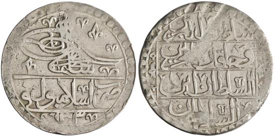 | Ottoman: Selim III (1789-1807), silver yuzluk / 100 para (31.30g), Islambul (Istanbul) mint, AH 1203 (1789 CE), RY 1. |