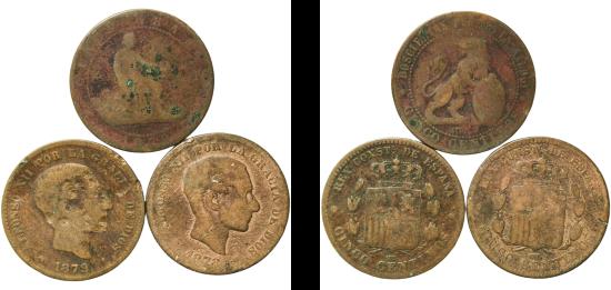 Spain Kingdom 1870 - 1879 5 Centimos (3 coins) Copper La Seca Mint 13.8g F