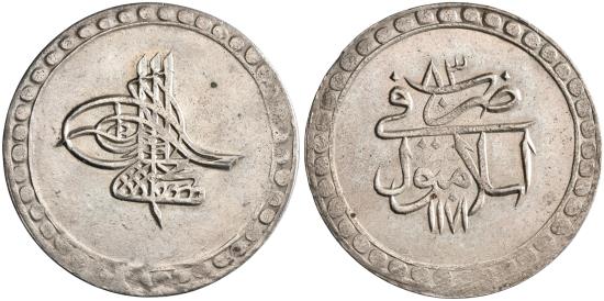 | Ottoman: Mustafa III (1757-1774), silver kurush / 40 para (18.78g), Islambul (Istanbul) mint, accession year AH 1171 (1757 CE), year [11]83. |