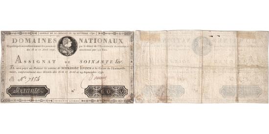 | | France, 60 Livres, 1790-09-29, B, VF(20-25) | | | Bust of Louis XVI on the right in a medallion at the top center, denomination in the center, serie and number of the banknote below on the left, signature on the right. | | FEATURES |