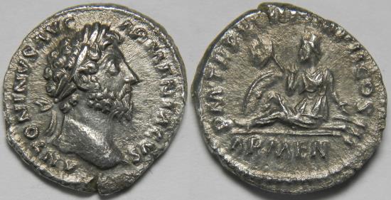 Roman Empire Marcus Aurelius AR Denarius (Rome, AD 164) Laureate head right / ΛRMEN in exergue, Armenia seated left in attitude of mourning, resting hand on bow to right; to left vexillum and shield. 3.16 grams, 19 mm. Extremely Fine. Slightly corroded. RIC 81, RSC 7. |