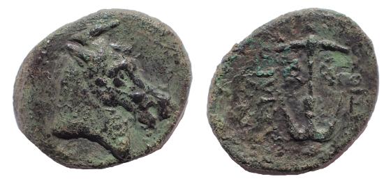| Seleukid Empire, Seleukos I Nikator Æ 20 mm. 5.0 gm. Seleucia II, 296-280 BC. Obv: Horned and bridled horse head to right. Rev: Anchor; ΒΑΣΙΛΕΩΣ to left, ΣΕΛΕΥΚΟΥ to right, monogram to outer right. SC 146; SNG Spaer 135; HGC 9, 73. Very Rare. |