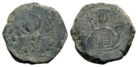 Manuel I Comnenus 1143-1181. AE Tetarteron (24 mm, 6.77 gram) Thessalonica O ΓEWΡΓΙΟC Facing bust of St. George, nimbate, holding spear and shield MANOVHΛ ΔΕCΠ Crowned, facing bust of Manuel, wearing loros, holding labarum and cross on globe Sear 1975. Heavy for the type, very fine |