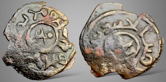 Islamic, Umayyad, Junayd bin Abdul Rahman، الجنيد بن عبد الرحمن المري (111-116 AH) AE Bilingual Fals. 1.82gm, 20mm, Found in Silk Road Region, possibly mined in Takharistan around 111-116 AH. Soghdian or Bactrian tamgha in center, name around, al-amir al-junayd (الجنيدالامير) Maybe followed by his father's name ( بن عبد الرحمن المري) / two Bactrian letters in