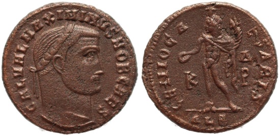 Maximinus II AE Follis Minted: Alexandria Size: 22mm Weight: 6.98 grams Obverse: GAL VAL MAXIMINVS NOB CAES, laureate head right Reverse: GENIO CAESARIS, Genius standing left, modius on head, naked except for chlamys over left shoulder (falls low), holding patera and cornucopiae,K-PA across fields and ALE in ex. |