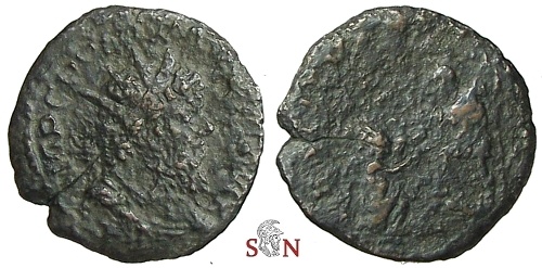 Postumus Antoninianus, struck AD 268 at Cologne mint. Obverse: IMP C POSTVMVS P F AVG, radiate, draped and cuirassed bust right. Reverse:RESTITVTOR