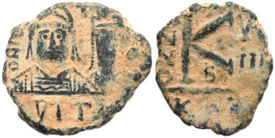 Obverse: DN IVSTINO ET SOFIA AC, Crowned busts of Justin and Sophia facing, cross between them, VITA below