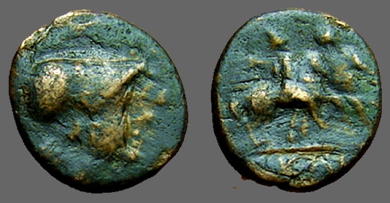 Apulia, Caelia. AE13 Athena / Dioscuri on horseback right