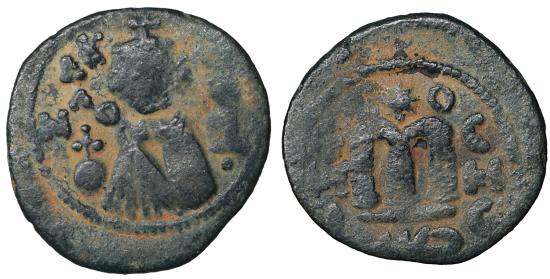 Islamic. Arab-Byzantine, Umayyad Caliphate. Æ Fals. Hims (Emesa), circa AD 685-690. 3.25 gr. – 21.1 mm. O:\ Crowned imperial bust facing, holding globus cruciger; KAΛON downwards to left, wavy line to right of crown, bi-hims in Arabic and star to right. R:\ Large cursive M above exergual line; star flanked by two annulets above, EMI downwards to left, CIC downwards to right, tayyib in Arabic in exergue. SICA I 539-42; Goodwin 14 var. Rare. aXF