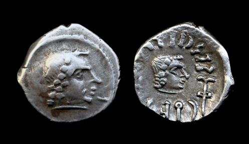 Rev: Small head right; oblong symbol to left, 'sceptre' to right.