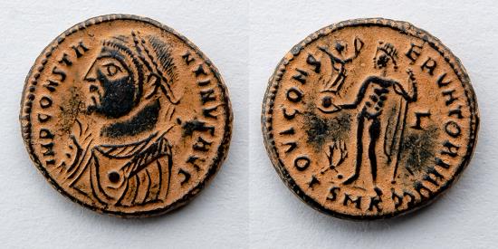 | ROMAN EMPIRE: Constantine I, AE Follis, AD 310-337 (19mm, 3.77g). Mint: Cyzicus, 317-320. Obverse: IMP CONSTA NTIMVS AVG; Bust of Constantine I, laureate, draped, left, holding scepter in right hand and mappa in left hand. Reverse: IOVI CONS EERVATORI AVGG; Jupiter, nude, chlamys draped across left shoulder, standing left, holding Victory on glove in right hand and scepter in left hand: Wreath-Bamma in fields, SMK in exergue. RIC 8. Beautiful desert patina. |