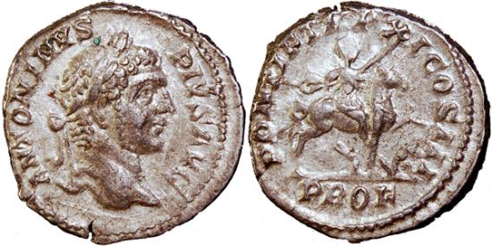 | TCRIS-29, Caracalla, AD 198-217, Denarius Rome mint, 3.74 grams, issued 208 AD. Obv: laureate head to right of Caracalla, around ANTONINVS PIVS AVG, rev. emperor on horseback, holding a spear with foe on the ground before him, around PONTIF TR P XI COS III, PROF in exergue, (S.-, cf. RIC 113, cf. RSC 468 but next year and to left). Nearly extremely fine and very rare apparently unpublished. |