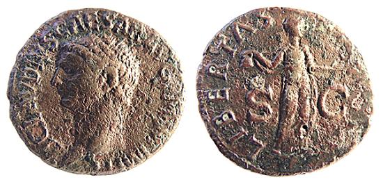TCRIB-50, Claudius, AE, AS, 41-54 AD AE, 11.18 gm. Obv: TICLAUDIVS CAESAR AVG PM TR P IMP, laureate head left, Rev: LIBERTAS AVGVSTA SC, Liberty standing right. C-47, RIC 97, BMC 145, S. 638. gVF