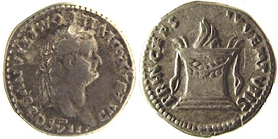 TCRIS-58, Domitian, AR Den, 3.38 gm, 84 AD. Obv. CAESAR DIVI F DOMITIANVS COS VII, laureate head right. Rev. PRINCEPS INVENTVTIS, Altar, garlanded and lighted. RIC-50. VF