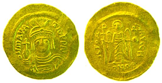 | TCBYZG-2, Maurice Tiberius, 582-602 AD, solidus, Au, Constantinople mint, Officina H, Obv: Helmeted with plume, draped and cuirassed bust of Maurice Tiberius facing, of narrow aspect, holding globe surmounted by cross, D N MAVR TIb PP AVI around, Rev. VICTORIA AVCC H, around, CONOB in exergue, Angle standing facing holding long staff surmounted by P with cross, and cross on globe. S.478, DOC.(5h), R.1002. With full broad flan, weak in places, otherwise good very fine, very rare officina. |