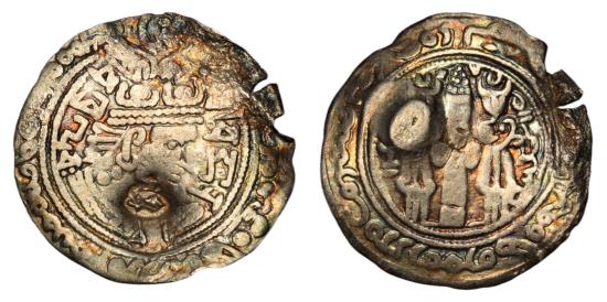 HUNNIC TRIBES, Western Turks. Sandan, Lord of the Oxus, circa 690-730. Drachm (Silver, 31 mm, 3.00 g ), mint in Bactria, circa 690-730. ŠRI CANDANA VAKHUDEVAH ('His Perfection Candana, Lord of the Oxus' in Brahmi); in outer margin, 'σρι βαyo αζρoβδδiyo σαvδαvo βαyo χoαδηo ('His Perfection, the Lord, the Chiliarch Sandano, His Perfection, the Lord' in Bactrian) Draped bust of Sandan to right, wearing earrings and an elaborate crown with two pelleted crescents, two symmetrical wings and a lion's head on top; on his neck, uncertain countermark. Rev. 'σρι βαyo δδηβοο βαγδδιγγο καγαvο σρι βαyo' ('His Perfection, the Lord, his Majesty, the Bactrian Kagan, His Perfection, the Lord' in Bactrian) Fire altar flanked by two attendants; in upper left field, six-pointed star; in upper right field, crescent; to left, AFZUT ('may increase' in Pahlawi; to right, GDH ('kingship' in Pahlawi) and an unidentified word. Göbl 244. Vondrovec, Type 244. With Countermark. Beautifully toned. Two minor edge cracks and the flan somewhat wavy, otherwise, about very fine.