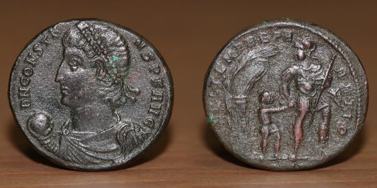 Roman Empire, Constans I AE Follis (348-350 AD) Obv: "DN CONSTANS P F AVG"; Bust of Constans, pearl-diademed, draped, cuirassed, left, holding globe in right hand. Rev: "FEL TEMP REPA-RATIO"; Soldier, helmeted, draped, cuirassed, advancing right, head left, leading small bare-headed figure from a hut beneath a tree with right hand and holding spear in left hand. Weight: 5.50gm Size: 22mm Very Less Green Patina, On Reverse with sand Patina, Near About EF, Good Very Fine.
