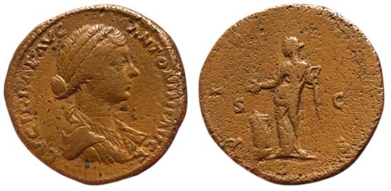 LVCILLAE AVG ANTONINI AVG F Draped bust r. Rev. PIETAS S – C Pietas, veiled, standing l., raising her r. hand over lighted altar and holding a perfume-box.