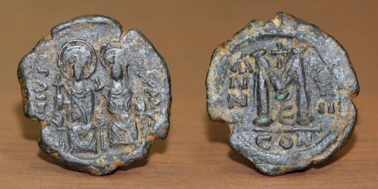 Byzantine Empire AE, JUSTIN II with SOPHIA (565-578 AD), Constantinople Minted. Obv: Legend with Justin left holding globus cruciger and Sophia right holding cruciform sceptre, nimbate, seated on double throne. Rev: "M" with "A / N / N / O" left, "II" right, "cross" above and "E" below; mintmark "CON" in exergue. Weight: 12.24gm, Size: 31.5mm Very Fine or About Good Very Fine, with some nice patina.