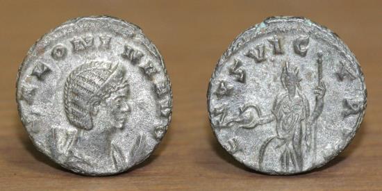 Roman Empire, Salonina AR Antoninianus, Date Struck 260-268 AD, Mint Rome. Obverse: "SALONINA AVG; Diademed, draped bust right on crescent. Reverse: "VENVS VICTRIX; Venus standing left, holding helmet and scepter, shield at foot.