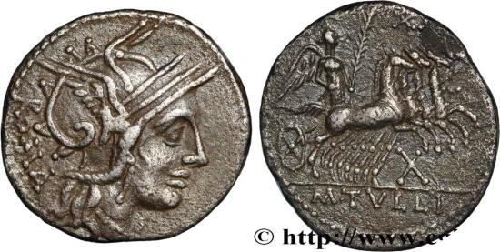 Reverse : M. TVLLI Victoria (la Victoire) dans un quadrige galopant à droite, tenant les rênes et une palme de la main gauche ; dans le champ au-dessus des chevaux, une couronne ; sous le quadrige, X