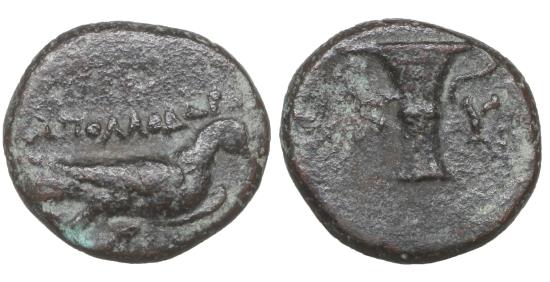 Aeolis. Kyme . ΑΠΟΛΛΟΔΩΡΟΣ, magistrate 320-250 BC. Bronze Æ2.40 gr. – 12.8 mm. Eagle standing right, AΠOΛΛOΔOPOΣ above / K-Y, . BMC 28.  XF