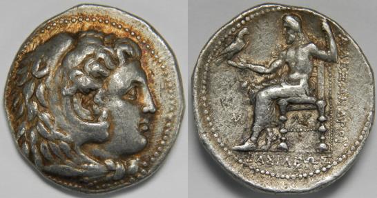 Kingdom of Macedon Philip III Arrhidaios AR Tetradrachm 323-317 BC Head of Herakles right, wearing lion skin / Zeus Aëtophoros seated left; M in left field, ΛY below throne. In the name and types of Alexander III (the Great). Struck in Babylon, circa 323-317 BC. 17.16 grams, 27 mm. Good Very Fine. Some tone. Minor marks and light scratches. Price 3692. Purchased from Münzen Gut-Lynt, Germany. |