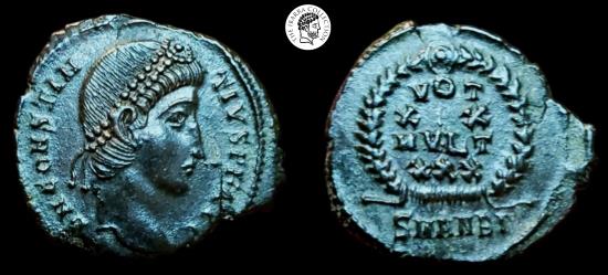 Obv. D N CONSTAN-TIVS P F AVG Pearl-diademed head of Constantius II to right. Rev. VOT / XX / MVLT / XXX in four lines within laurel wreath; in exergue, SMANBI. 16mm, 1.68g. RIC 113. Extremely Fine.