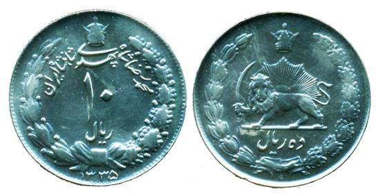 IRAN, PAHLAVI: 1956 large copper-Nickle 10 Rials SH 1335