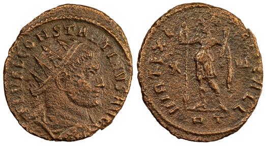 AE Half Follis 2.56g. 20mm. 312-313 A.D. Rome Mint Radiate, draped and cuirassed bust r., seen from back. FL VAL CONSTANTINVS AVG Virtus standing l., r. arm leaning on reversed spear, l. holding parazonium; X-VI across fields; In ex.: RT VIRT EXE-RCIT GALL RIC VI 360 Quite rare. Brassy brown surfaces. Good detail despite issues. Once cleaned, now repatinating. Some porosity and roughness. A rare pre-reform radiate fraction.