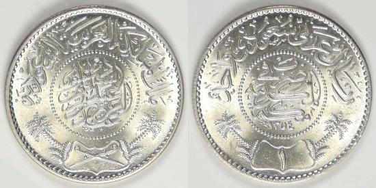 Rev: Arabic inscription “Struck in Mecca” within beaded circle with the legend “One Saudi Arabian riyal” above and numerical value below within design flanked by palm trees