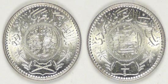 Rev: Inscription “Struck in the Holy City of Mekka” within beaded circle, legend “Quarter Saudi Arabian Riyal” above, value below within design flanked by palm trees