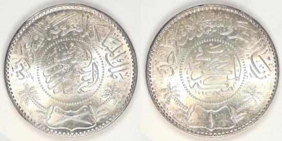 Rev: Arabic inscription “Struck in Mecca” within beaded circle with the legend “One Saudi Arabian riyal” above and numerical value below within design flanked by palm trees