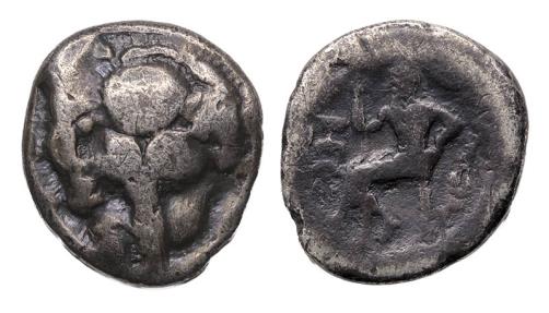 BRUTTIUM, Rhegion. Circa 450-445 BC. AR Drachm (18,5 mm, 3.68 grams). Facing lion’s head / Iokastos seated left, holding scepter; all within laurel wreath. Herzfelder 28 (D17/R24); HN Italy 2478; SNG Lloyd 686 (same dies). Near VF, heavily toned. Very rare!