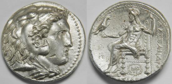 Seleukid Empire Seleukos I Nikator AR Tetradrachm 312-281 BC Head of Herakles right, wearing lion skin / Zeus Aëtophoros seated left; H in left field, monogram within wreath below throne. In the name and types of Alexander III (the Great) of Macedon. Struck in Babylon, circa 311-300 BC. Good Extremely Fine. Very attractive and well detailed piece. Sharp struck from artistic dies. Minor flan flaw on Herakles's face and minor marks. SC 82.7, HGC 9 10f, Price 3708. Purchased from Savoca, München. |