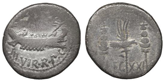 MARK ANTONY. 32-31 BC. AR Legionary Denarius 18 mm. 2,94 g. Patrae(?) mint. Galley right / LEG XXI, legionary aquila between two standards. Crawford 544/37; CRI 381; Sydenham 1244; RSC 58. Toned Good VF. Not to be confused with a similar legion under the command of Octavian, this Antonian legion was either disbanded or incorporated into another legion after Actium.
