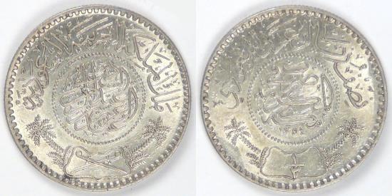 Rev: Arabic inscription “Struck in Mecca” within beaded circle with the legend “Half a Saudi Arabian riyal” above and numerical value below within design flanked by palm trees