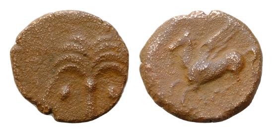 CARTHAGE. c.330-300 BC. Æ Unit 14,5mm, 2,2g,. Uncertain Sicilian mint. Palm tree / Pegasos flying left. uncertain Punic legend below  Extremely fine . rare