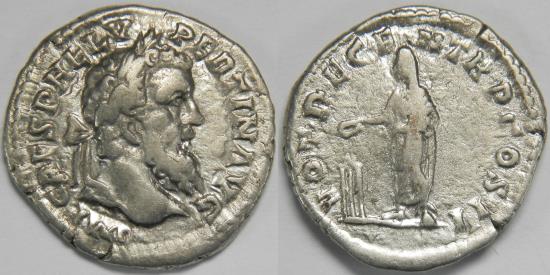 Laureate head right / Pertinax standing left, holding volumen and sacrificing out of patera over tripod to left.