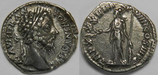 Roman Empire Marcus Aurelius AR Denarius (Rome, AD 177-178) Laureate head right / Minerva standing left, holding branch and resting hand on shield set on ground, spear in crook of arm. 3.28 grams, 18 mm. About Extremely Fine. Tiny deposits. Rare. RIC 387, RSC 956. Purchased from Rex Numismatics, Rotterdam. |