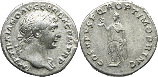 Roman silver coin of the Emperor Trajan - COS V PP SPQR OPTIMO PRINC