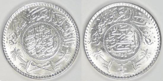 Rev: Arabic inscription “Struck in Mecca” within beaded circle with the legend “Half a Saudi Arabian riyal” above and numerical value below within design flanked by palm trees