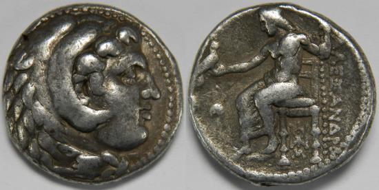 Kingdom of Macedon Alexander III (the Great) AR Tetradrachm 336-323 BC Head of Herakles right, wearing lion skin / ΑΛΕΞΑΝΔΡΟΥ, Zeus Aëtophoros seated left; sickle in left field, monogram and M below throne. Lifetime issue. Struck in circa 324-323 BC, Babylon. 16.92 grams, 24 mm. Very Fine. Dark tone. Minor marks and a tiny flan flaw on obverse. Price 3622. Purchased from Solidus Numismatik, München. |