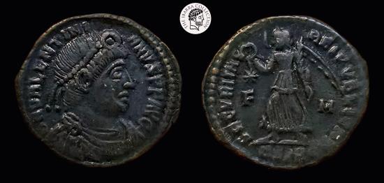Valentinian l, 364-375 AD. AE3. Siscia mint. Diademed draped bust / Victory advancing with wreath and palm. 17mm, 2.11g. RIC 14. Uneven aXF, brown patina.