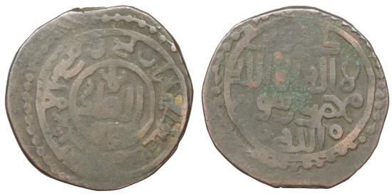GREAT MONGOLS: Malik of Kurzuwan, June-July 1221, AE jital (4.00 gr. – 20.6 mm). Siege issue. Kurzuwan mint, AH618, Dated Rabi’ II AH 618 (May-June AD 1221). Kalima in three lines across field / “al-malik” across field; date in outer margin. Tye 324.1; Nyamaa 31; Album 1971. Scarce. VF+