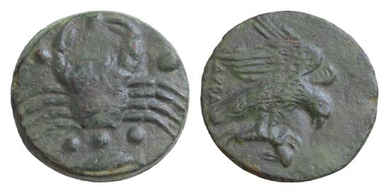 | Sicily, Hexas,Akragas, c. 420-406 BC, AE, 20mm 8.27g . Eagle flying r., holding hare with talons, Crab; at side five pellets, below epinephelus |