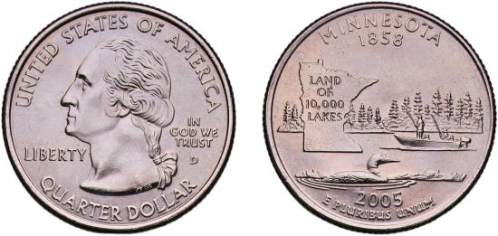 United States Federal republic 2005 D ¼ Dollar "Washington Quarter" (Minnesota) Copper-nickel clad copper Denver Mint (248400000) 5.73g BU KM 371 Schön 371