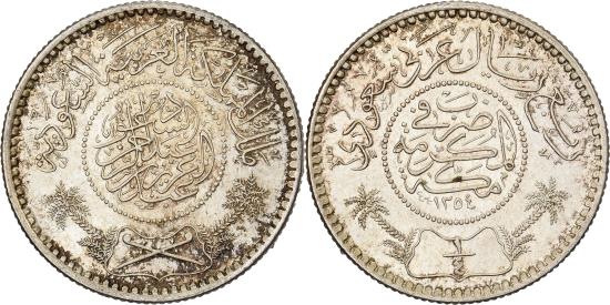 | | Saudi Arabia, 1/4 Riyal, 1935/AH1354, Royal Mint, Silver, , KM:16 | | | Inscription within beaded circle, legend above, crossed swords below within design flanked by palm trees, Inscription within beaded circle, legend above, value below within design flanked by palm trees, ملك المملكة العربية السعودية
