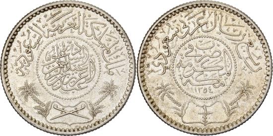 | | Saudi Arabia, 1/4 Riyal, 1935/AH1354, Royal Mint, Silver, , KM:16 | | | Inscription within beaded circle, legend above, crossed swords below within design flanked by palm trees, Inscription within beaded circle, legend above, value below within design flanked by palm trees, ملك المملكة العربية السعودية